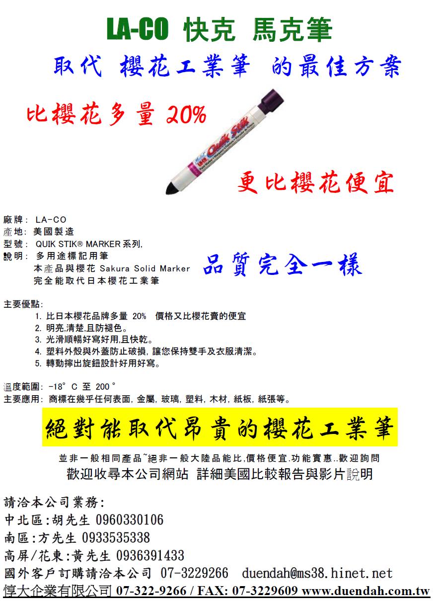 工業馬克筆 / 溫度筆 / 耐高溫筆 /測漏劑 / 膠封修補 > 馬克筆 / 耐溫筆 /等 (點我) > (美國) LA-CO 快克 馬克筆 (同櫻花馬克筆)