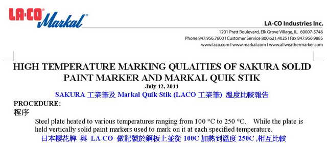 美國LACO原廠出示與日本SAKURA櫻花耐溫報告 (經中文翻譯)