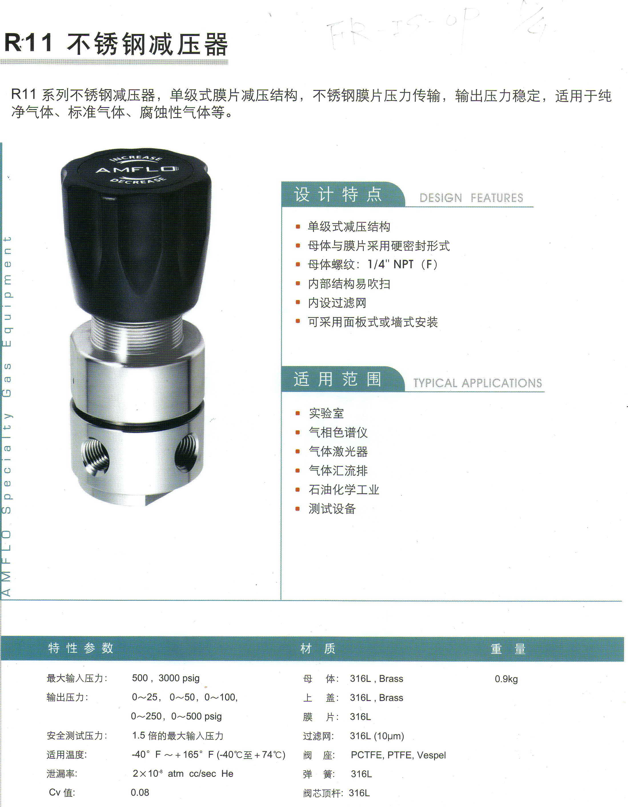 AMFLO 不鏽鋼 特殊氣體用 壓力調整器 R11