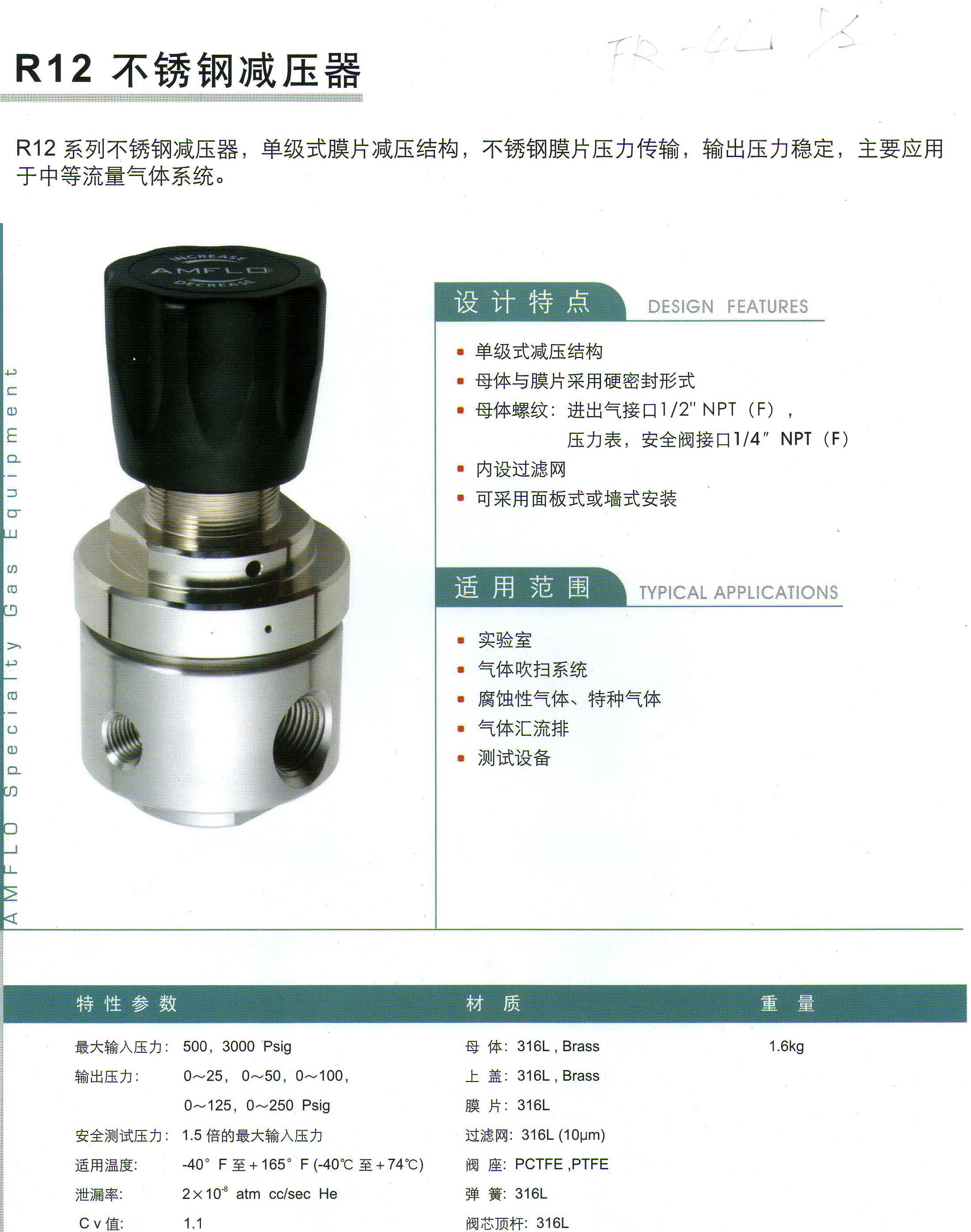 *工業級* 氣體調整器 / CO2 加熱器 / 流量計 / 小型錶 / 等 > 不鏽鋼 / 特殊 (點我) > AMFLO 不鏽鋼 特殊氣體用 壓力調整器 R12