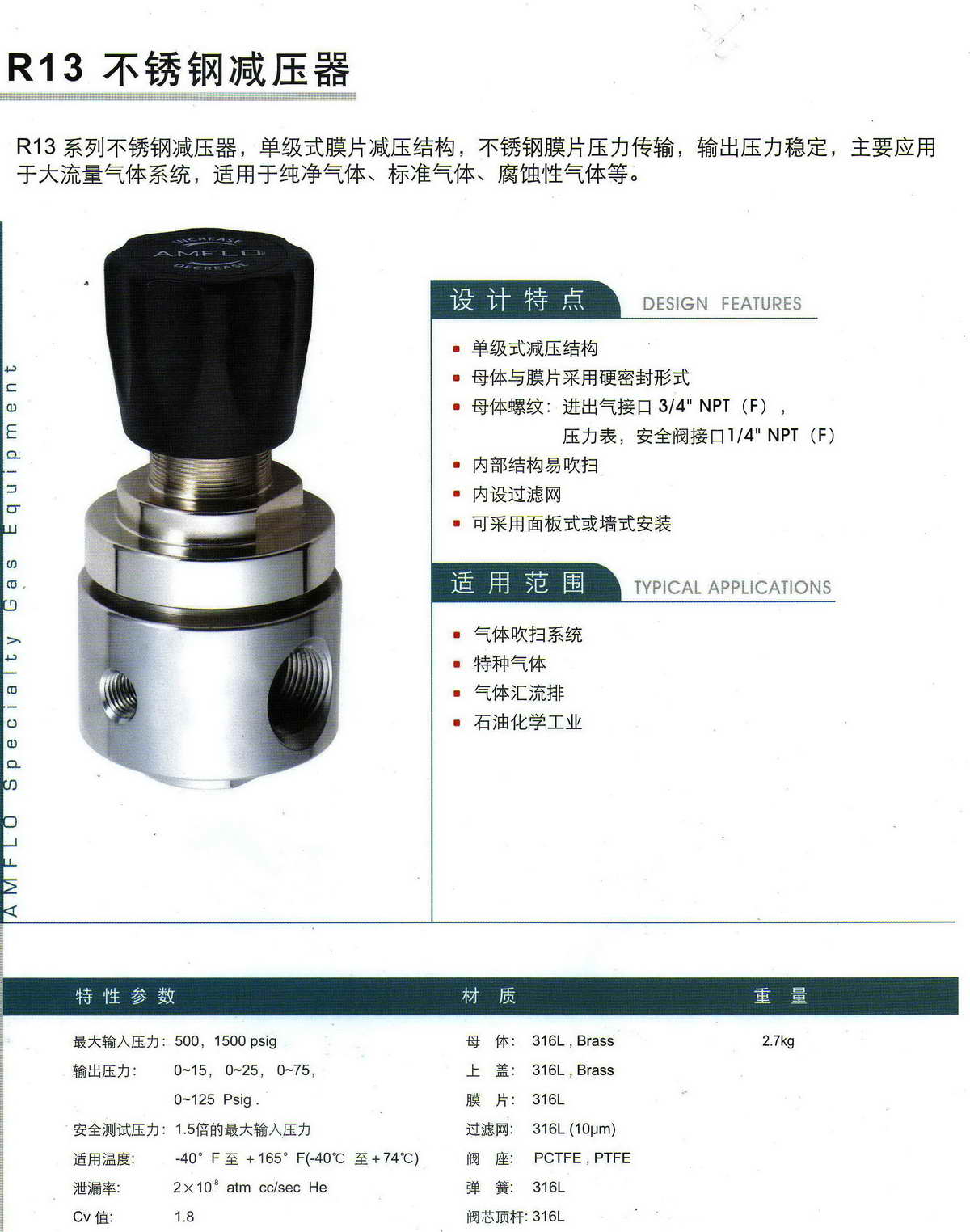 *工業級* 氣體調整器 / CO2 加熱器 / 流量計 / 小型錶 / 等 > 不鏽鋼 / 特殊 (點我) > AMFLO 不鏽鋼 特殊氣體用 壓力調整器 R13