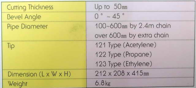 TANAMAX 田中 YK-200 自動切管機 廠牌:TANAMAX 田中 型號:YK-200 自走型 產地: 日本 說明:使用於碳鋼板材火焰切割,採用高拉力鏈目傳動, 作為圓管切斷,可調整火口角度切斷 價格實在.功能實惠.耐用.歡迎詢問 本公司具備維修能力.一年修理各廠牌自動機20臺左右. 且後勤零件在庫充足.買後無後顧之憂.不會變孤兒機 配件: 1.分配器 2.氣體開關 3.三色管 4.吹管 5.** 6.** 7.火嘴 備註:(1)軌道可另購 (2)切割槍頭可改裝為電離子切割..等等設備. 歡迎改裝或訂做 切割能力請見下方: